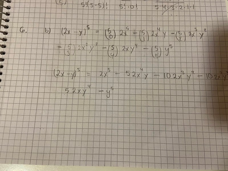 Man ska utveckla (2x-y)^5 mha binomialsatsen och jag kom fram till detta, bifogar bild men det är tydligen fel. Vad är det jag gjort fel? Tack i förhand!