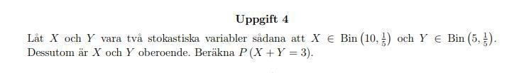kalle100 skrev:Okej så är p samma adderar man bara det första värdet, och om man gör betigad sannolikhet antar jag att man tar alla kombinationer som blir 3?