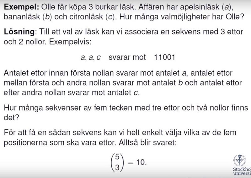 "Om Olle istället hade valt abc hade sekvensen då sett ut 101010? Och således fått 6 choose 3?"