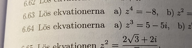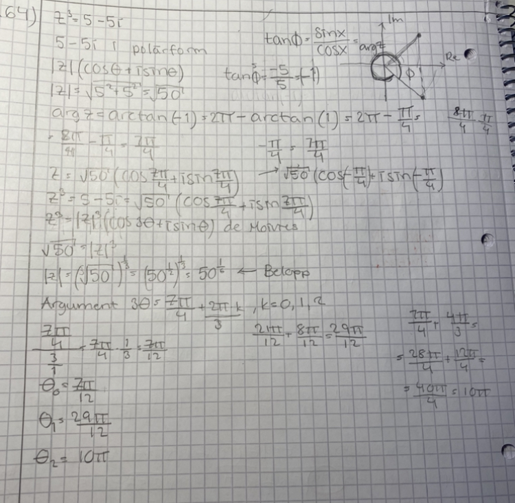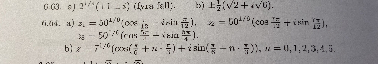 Jag behöver hjälp med 6.64 a). Beräkningarna är lite röriga, men visst blir argz=7pi/4? För sedan får jag beloppet, och därefter ska jag räkna ut argumenten, men jag ser redan nu från facit (se nedan) att mina argument inte stämmer överens med facit. Ska man använda negativt argument dvs. -pi/4? Eller vad gör jag för fel?
