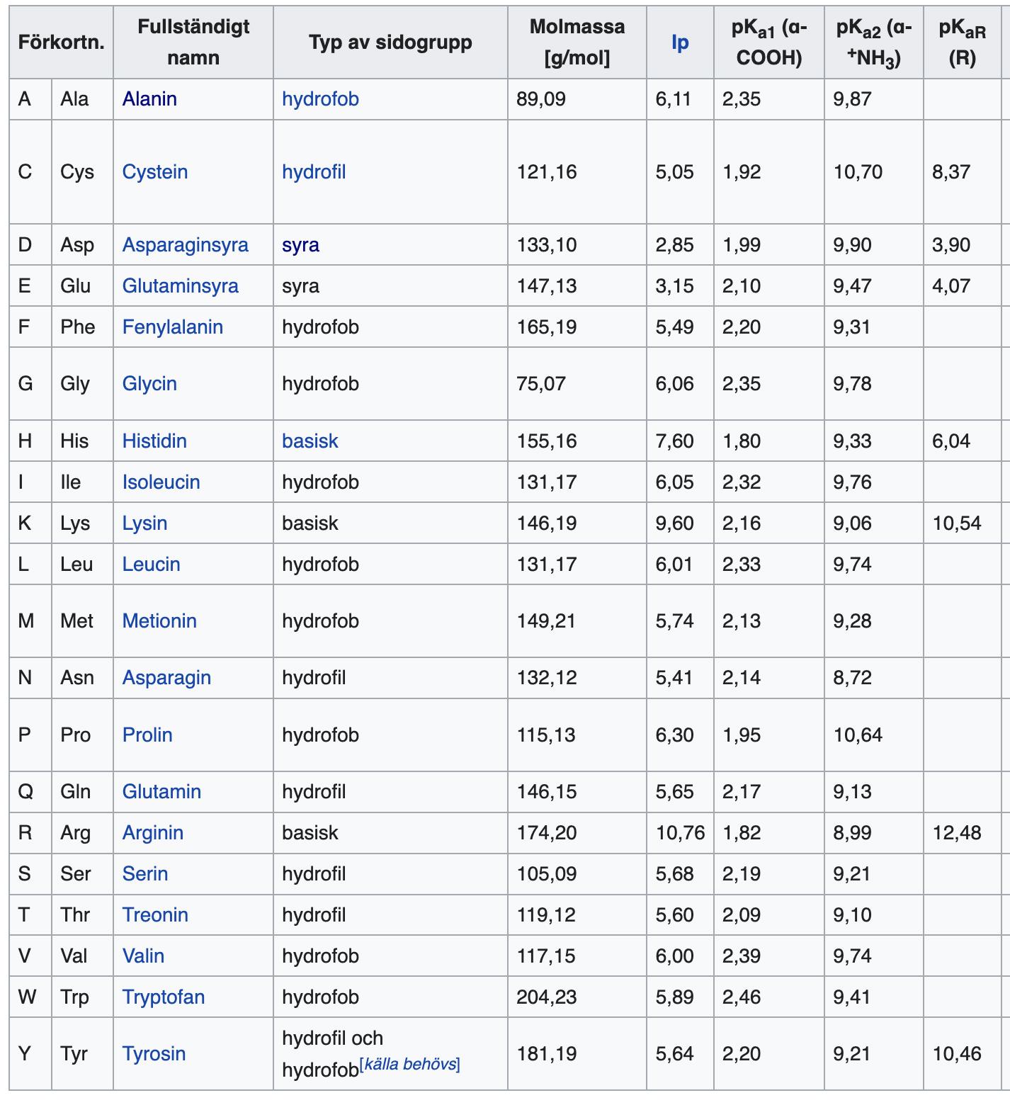 Här finns det en tabell med pka för carboxyl- och ammoniumgruppen samt restens funktionella grupper