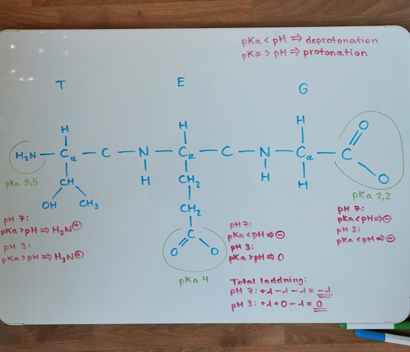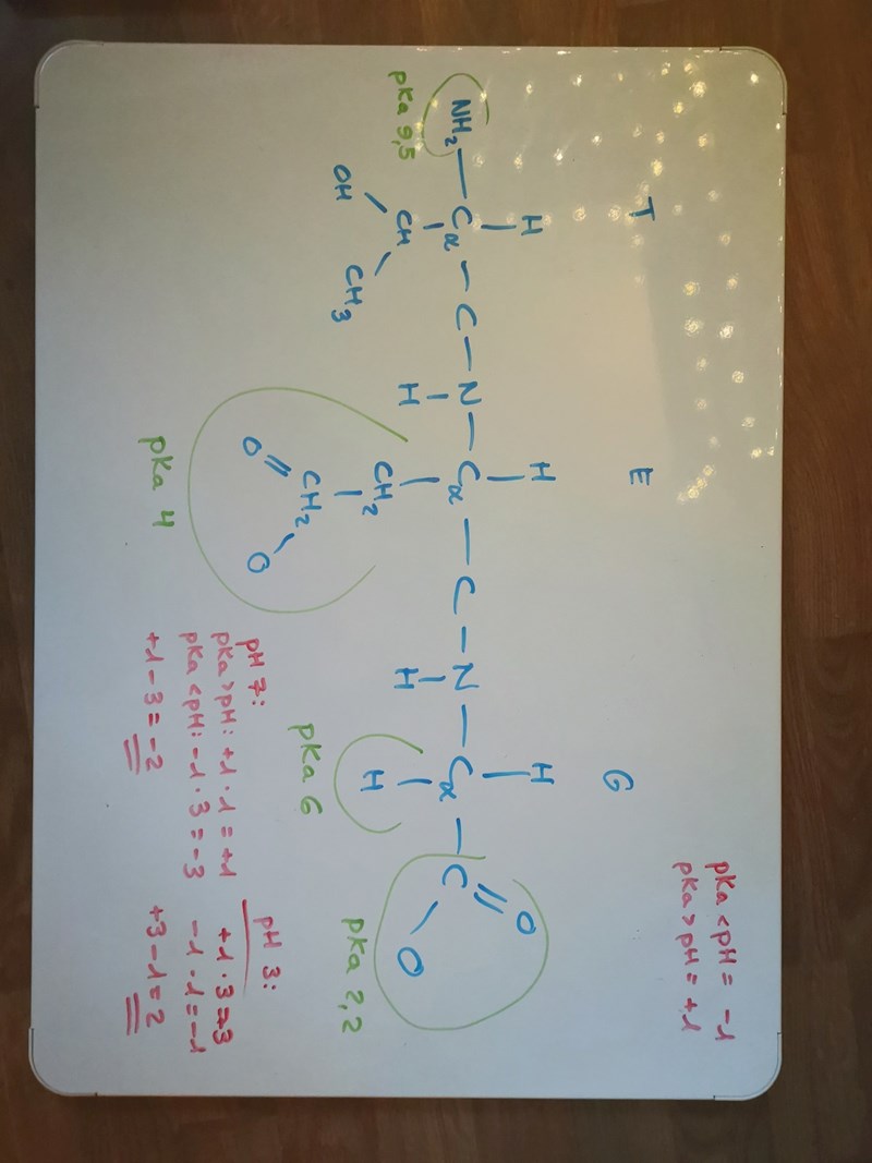 Tripeptiden TEG, sker inte ut som du ritat den vid något enskilt pH. Det du ritat är ett mellanting av hur det ser ut vid flera olika pH. Och laddningarna saknas! T.ex. R-COOH vs. den protolyserade formen.