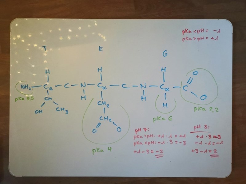 Det kan vara lite lurigt i början att hålla koll på att vissa sidokedjor tappar laddning, och vissa får laddning. Men inte vid precis samma pH.