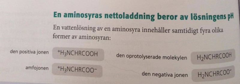 - kan en aminosyra finnas i fyra olika former samtidigt, vilken som dominerar beror på aminosyrans isoelektriska punkt, Ip, och lösningens pH-värde. Förklara! Använd formlerna över de fyra formerna sid och tabell 11.2 som underlag för ditt resonemang.