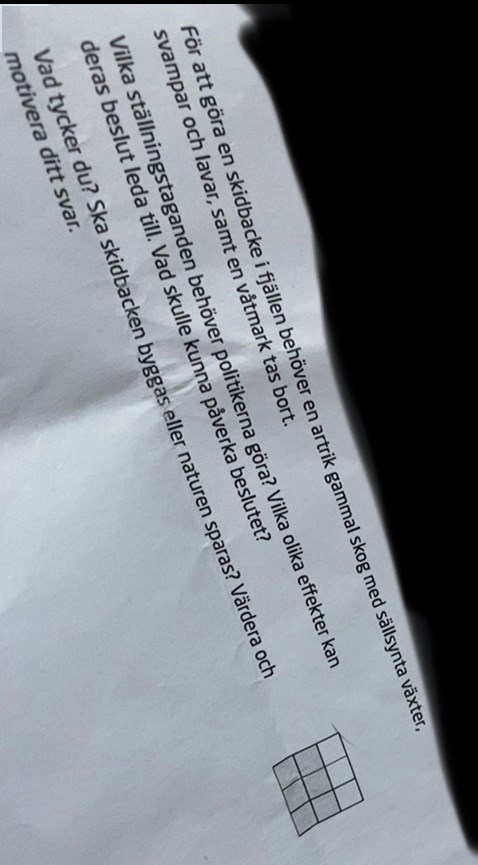 Uppgiften handlar om att du skall analysera och diskutera för och nackdelar för var och en av de två alternativen - skidbacke eller sparad natur. Avsluta med att välja ett alternativ, och motivera varför.