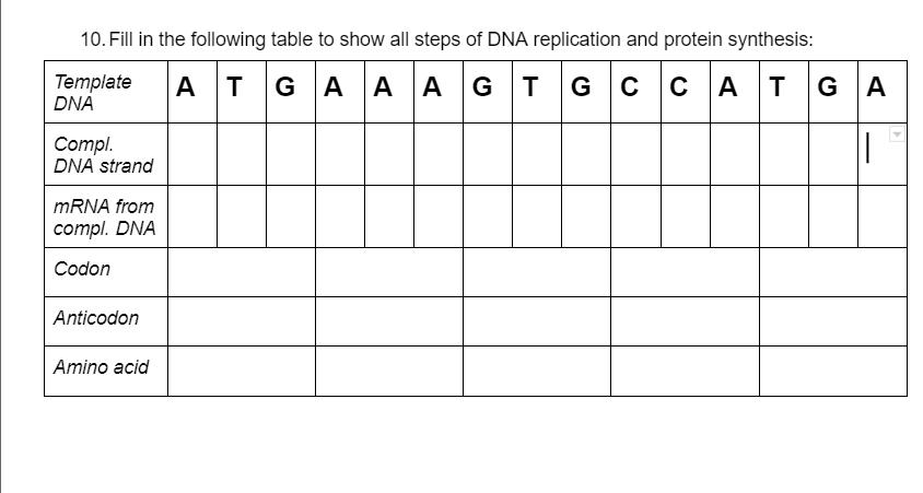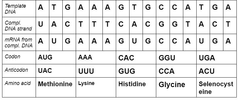 Du skall fylla i hur sekvensen översätts från DNA via mRNA till tRNA och proteinsekvensen.