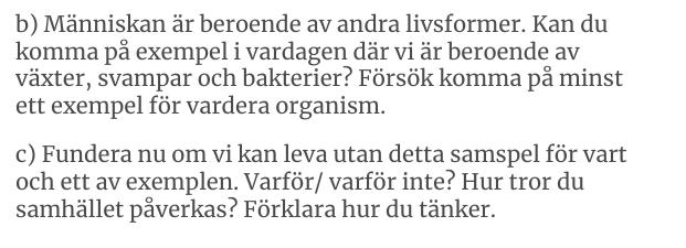 I fråga C förstår jag inte alls vad det jag ska fundera... ska jag förklara "konsekvenser" för samhället utan svampar bakterier och växter?????