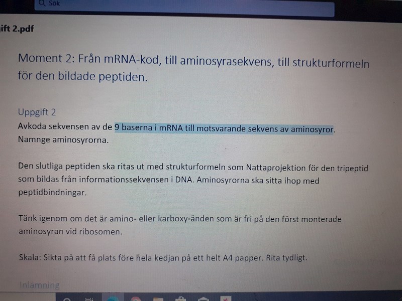 Hej! Jag behöver avkoda lite sekvenser idag. Informationssekvensen i min uppgift för tillverkningen av mRNA är: