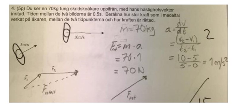 Min lösning är under uppgiften. Tror inte att jag fått rätt svar. Förstår inte hur man ska göra med tiden 0,5 s. Tacksam på svar!