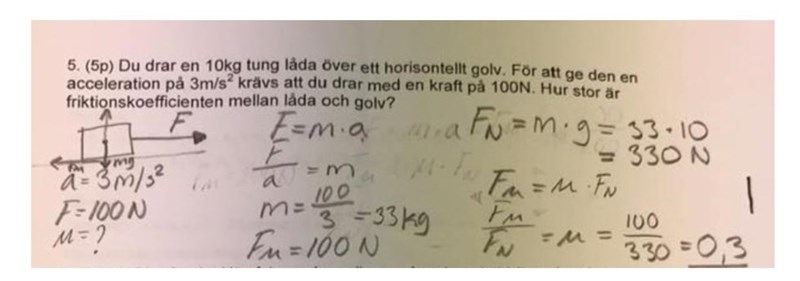 Min lösning är under uppgiften. Vet inte om jag gjort rätt. Är normalkraften lika med tyngdkraften? Tacksam på svar!