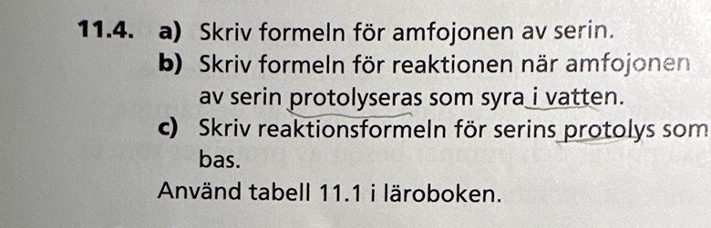Skriv en reaktionformel för protonöverföring då serin agerar som en bas.