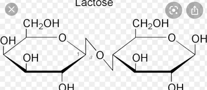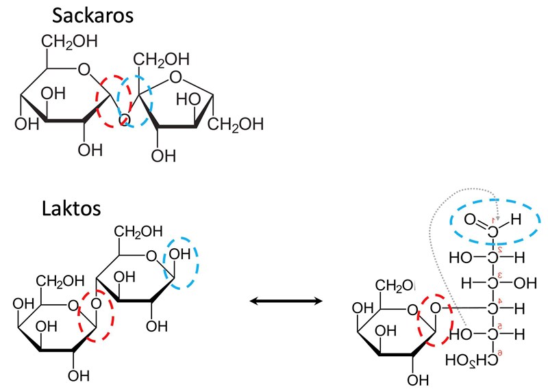 I laktos är galaktos bundet med sitt reducerande kol (röda ellipsen) genom glykosidbindningen till glukos fjärde kol. Det gör att glukosenheten kan ringöppnas och då bildas en fri aldehyd, som kan reducera andra partiklar!