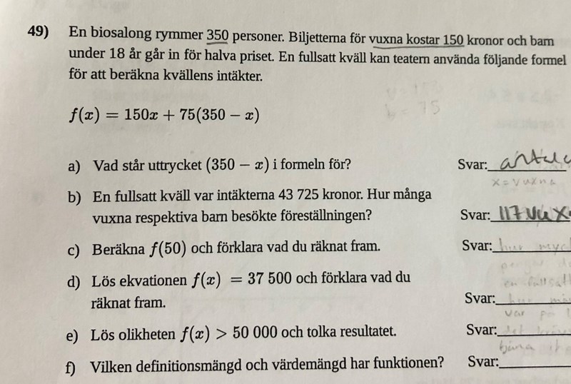 d) jag får svaret x=150 . Vilket betyder att det kom 150 vuxna och 200barn.