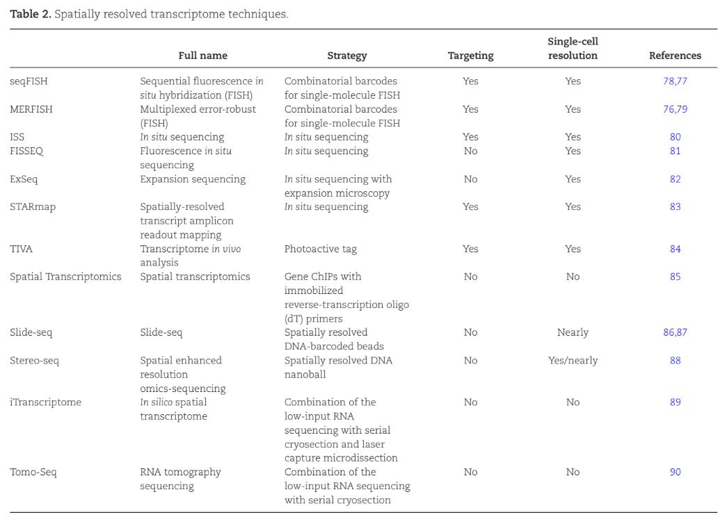 Eller som i tabellen, där gen chip inte klassas som single cell resolution, troligtvis för att själva chippet innehåller snuttar av gensekvenser "probes" och urskiljningslöst fångar komplementärt DNA. Och det upparbetade cDNA som används vid hybridiseringen till dessa probes, behöver inte nödvändigtvis komma ifrån individuella celler med en bestämd koordinat.