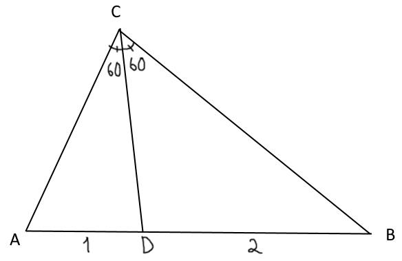 Uppgiften lyder "I en triangel är en vinkel 120. Bisektrisen till denna vinkeln delar motstående sida i två delar med längderna 1cm respektive 2cm. Beräkna triangelns area."