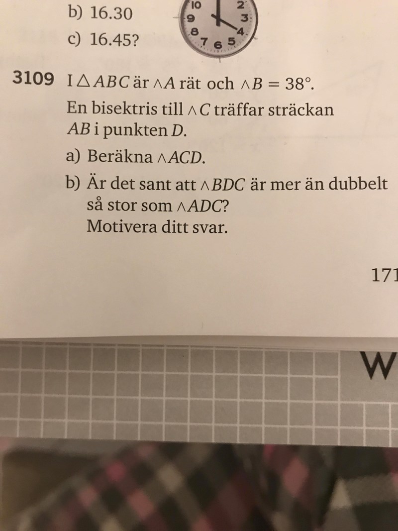 Här är uppgiften och svaret till a) är 26 grader. Har ingen aning på hur jag ska få fram c. Det finns inga parallella linjer och jag kan därför inte använda mig av några samband mellan vinklarna så som alternatvinklar, sidovinklar mm.