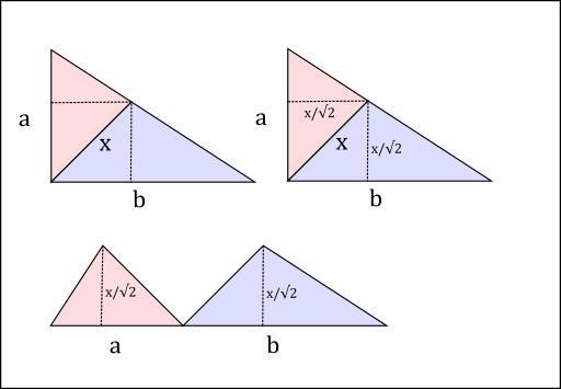 Jaha, jag tror att det lossnade nu. Det bildas en kvadrat i den stora triangeln och sidorna blir höjden i trianglarna och dem sidorna får man från bisektrisen i den räta vinkeln.