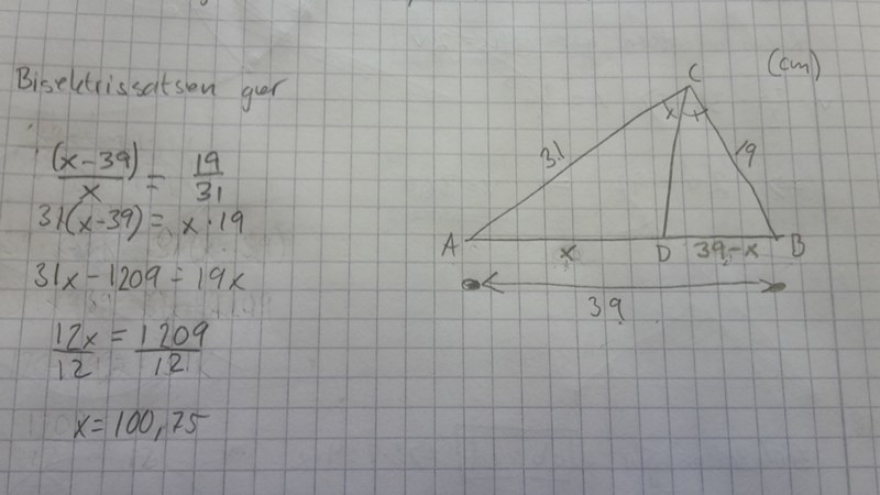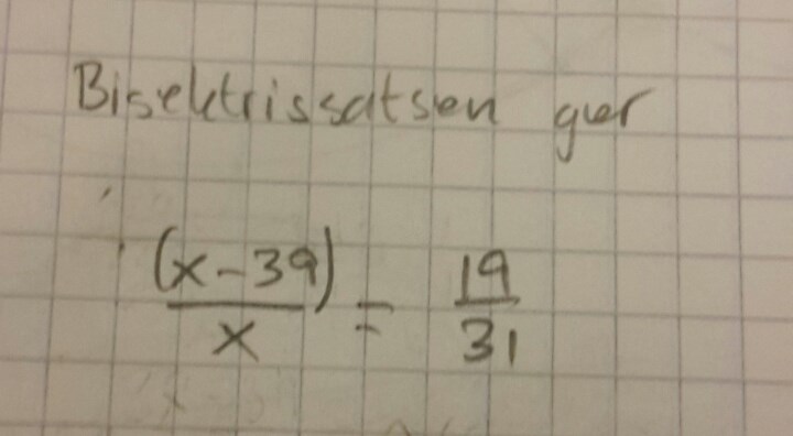 Smutstvätt skrev :Korsmultiplikation ger att 31(x-39)=19x, kommer du vidare?