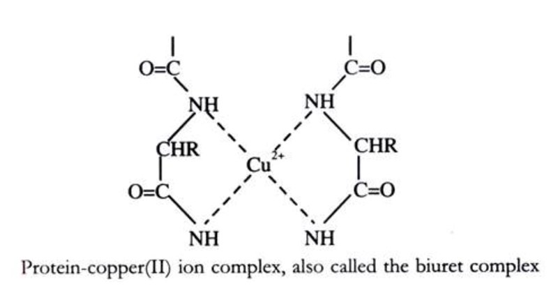 I proteiner (och molekyler med fler än en amidgrupp, som biuret) sitter redan minst två amidgrupper i samma molekyl, och då kan varje molekyl skapa två bindningar till kopparjonen. Med två bindningar kan kopparjonen hållas kvar tillräckligt väl för att komplexet skall kunna bildas. Och för att få totalt fyra bindningar i komplexet kan en annan del av proteinet delta, eller en annan molekyl med fler amidgrupper, som i bilden: