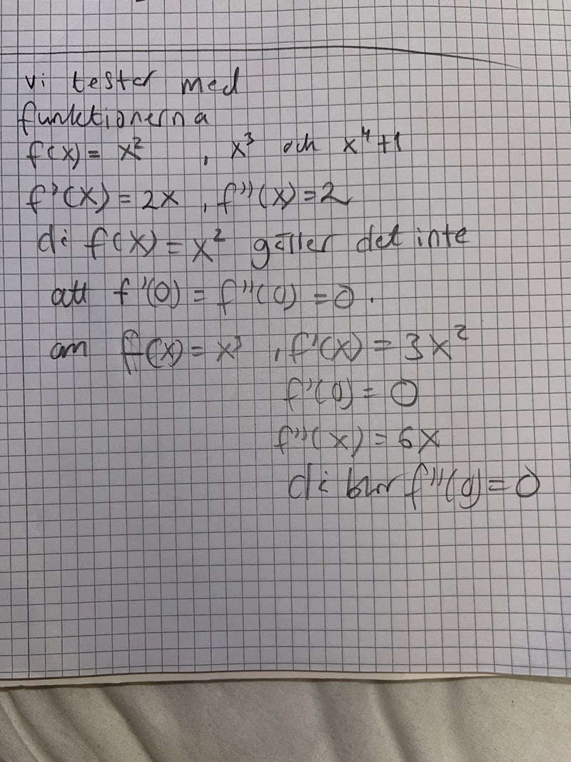 Alltså genom att visa att f(x)=x2 inte ger oss derivatan eller andraderivatan noll så kan jag motbevisa påståendet. Alltså f(x)=x2 . f’(x)=2x och f”(x)=2
