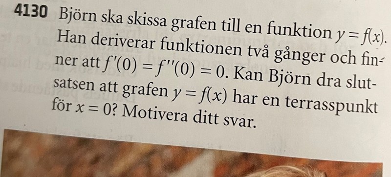Din uppgift är att avgöra om det betyder att f har en terrasspunkt vid x = 0.