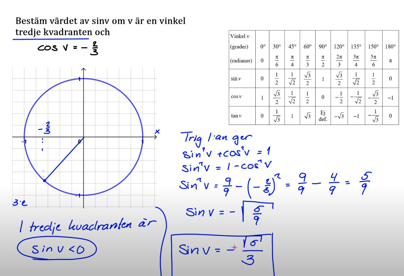 Om du vet sinus för en vinkel och vill ta reda på cosinus för samma vinkel så är det enklaste sättet att använda trigonometriska ettan.