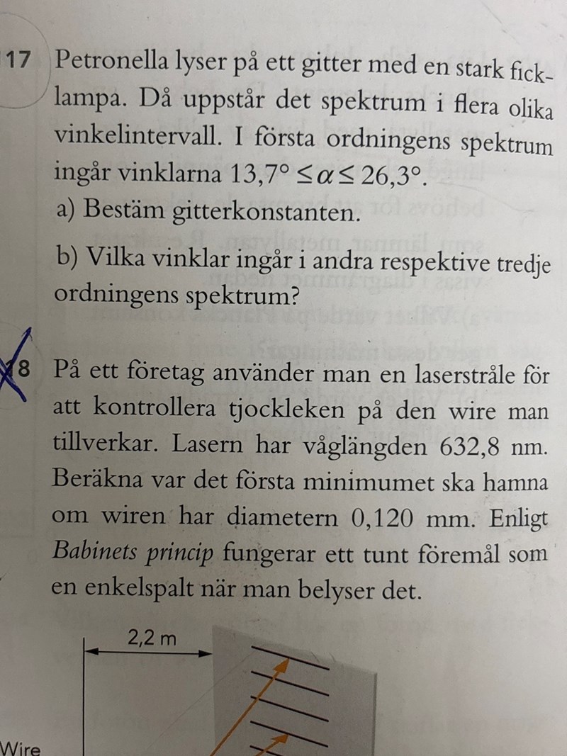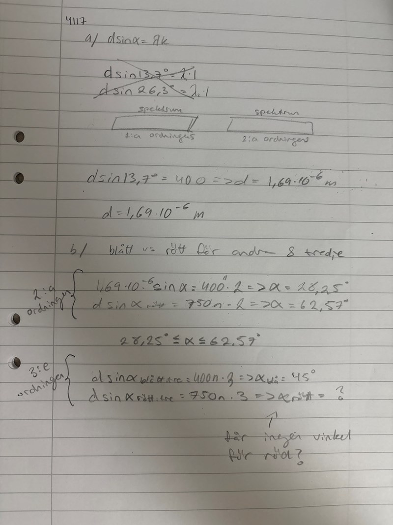 Hej! På fråga B har jag två frågor. För andra ordningens spektrum ska jag inte ha större än och lika med, inte heller mindre än och lika med utan bara större än och mindre än, men varför? Och varför får jag ingen vinkel för övre delen av spektrumet för strecken ordningen, dvs det röda ljuset?