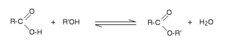 Om du tittar på reaktionsformeln för en esterreaktion, ser du att det som produkt alltid bildas vatten tillsammans med estern. Reaktionen är dessutom reversibel, då vatten kan attackera och klyva den bildade estern - med resultatet att alkoholen och karboxylsyran du började med återbildas.
