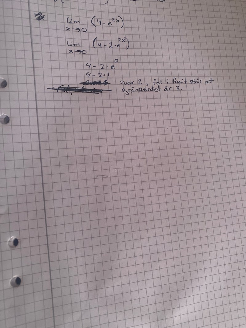 Om du använder uttrycket på första raden (lim (x->0) 4-e^(2x) och sätter in x=0 blir det 3.