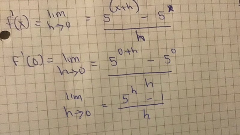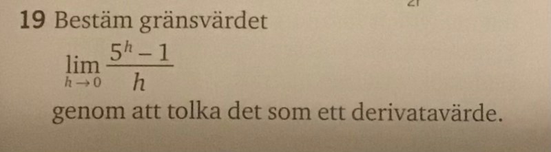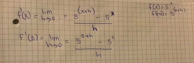 Okej så, den där limesfunktion i uppgiften är derivatan av funktioner f(X)= 5^X i punkten x=0 ?