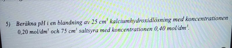25 cm3 Ca(OH)2 med konc 0,20 mol/dm3 innehåller 0,025*0,20*2 = 0,010 mol hydroxidjoner