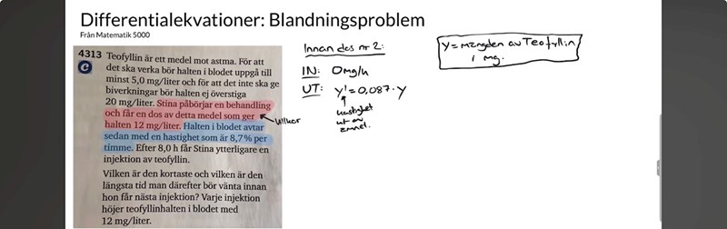 Det borde stå att y(t) = mängden Teofyllin I blodet vid tiden t timmar, mätt i mg/liter.