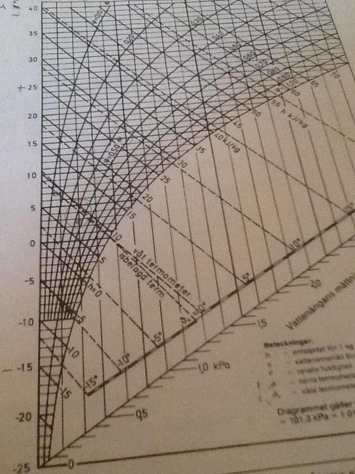 Konstigt jag få andra värde.Jag kan beskriva vad jag gjorde för dig. Från +25 varma kanalen som du ser på höger sidan mellan 30C och 20C jag går ner,och från höger de avböjda RH=0,50 om man kommer ner så hamnar jag där jag har gjort en ring och följer man ner den sträcket så kommer jag till 26 kJ/kg.När det gäller den andra punkten -15 kalla kanalen därnere mellan -20 och -10C från höger däruppe igen de avböjda RH= 0,50 kommer man till den andra punkten jag har gjort en ring som du ser på bilden och följer man ner sträcket så hamnar man på 8 kJ/kg