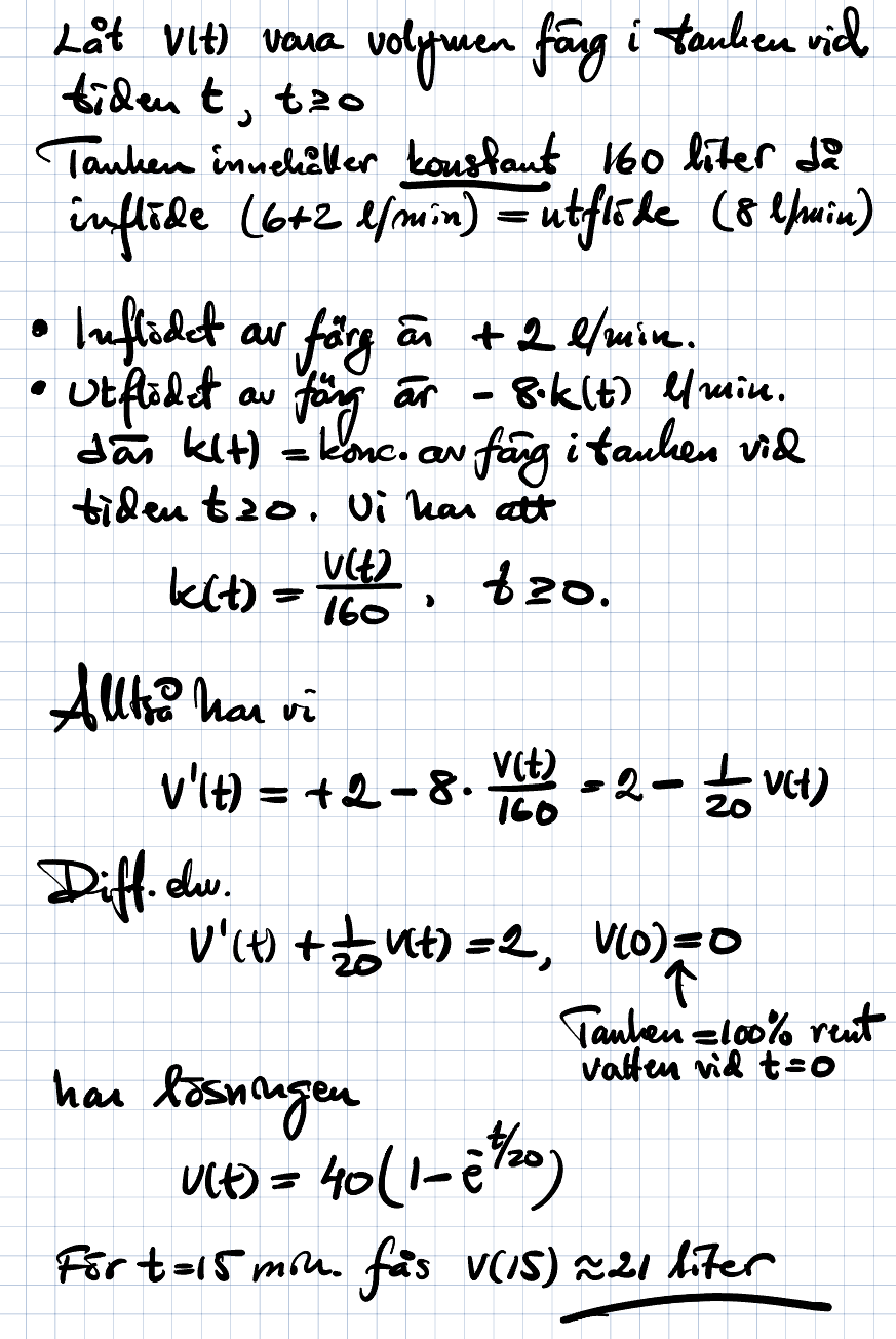 En tank med 160 L vatten blandas med färgämne. Det tillförts 6 L/min rent vatten och 2 L/min färgämne. Blandningen rinner ut med hastigheten 8L/min. Hur många liter färg finns i tanken efter 15 min?
