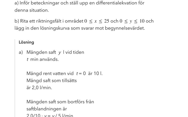 Först, beteckningarna som används. Man har i lösningsförslaget använt y(t) som mängden saft som funktion av t. Men jag tycker du kan fortsätta använda m(t) (med enheten liter), det är ett bra val som är intuitivt att förstå.