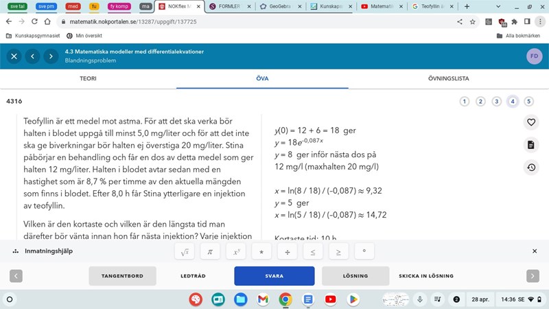 Vilken blir koncentrationen om man har koncentrationen 8 mg/liter och får en ny spruta som höjer koncentrationen med 12 mg/liter?