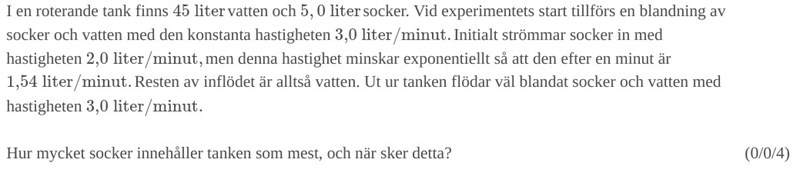 Svar: Tanken innehåller 8,4 liter socker som mest efter 5,3 minuter.