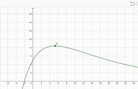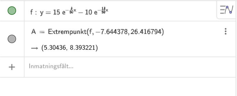 Nu när den allmänna lösningen är beräknad använder vi ett digitalt verktyg som Geogebra för att undersöka vilken graf den beskriver. Sedan finner vi en övre extrempunkt på grafen (som då antyder , det vill säga den maximala mängden socker som finns i tanken under en viss tidspunkt x. Se bild nedan.
