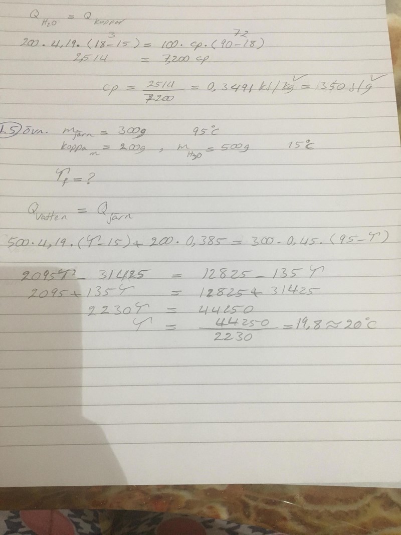 En järnbit med massan 300 g och temperaturen 95◦C sänks ned i en kopparkalorimeter med massan 200 g vilken innehåller 500 g vatten med temperaturen 19◦C. Vilken blir blandningstemperaturen