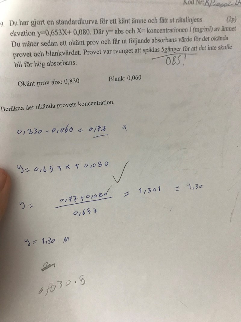 Du har den räta linjen y = kx+m där y är absorbansen och x är koncentrationen.Om du sätter in din justerade absorbans får du ekvationen 0,770 = 0,653x+0,080 Vilket värde på koncentrationen x ger detta?