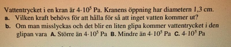 Jag sitter fast på a). Jag tänkte att F=pA där A är öppningens cirkel (pi*r²)