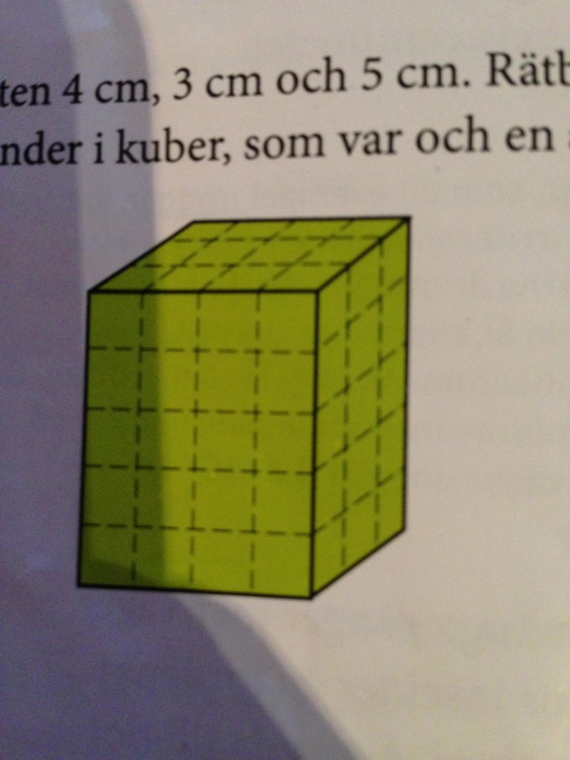 Bilden visar ett rätblock med måtten 4 cm,3cm och 5cm. Rätblocket målas grönt. Därefter sågas det sönder i kuber, som var och en är cm. Hur många av kuberna har