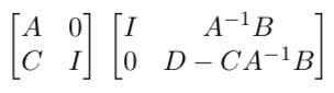 ABCD=A0CIm×mXYZW\begin{bmatrix} A & B \\ C & D \end{bmatrix} = \begin{bmatrix} A & 0 \\ C & I_{m \times m} \end{bmatrix} \begin{bmatrix} X & Y \\ Z & W \end{bmatrix},