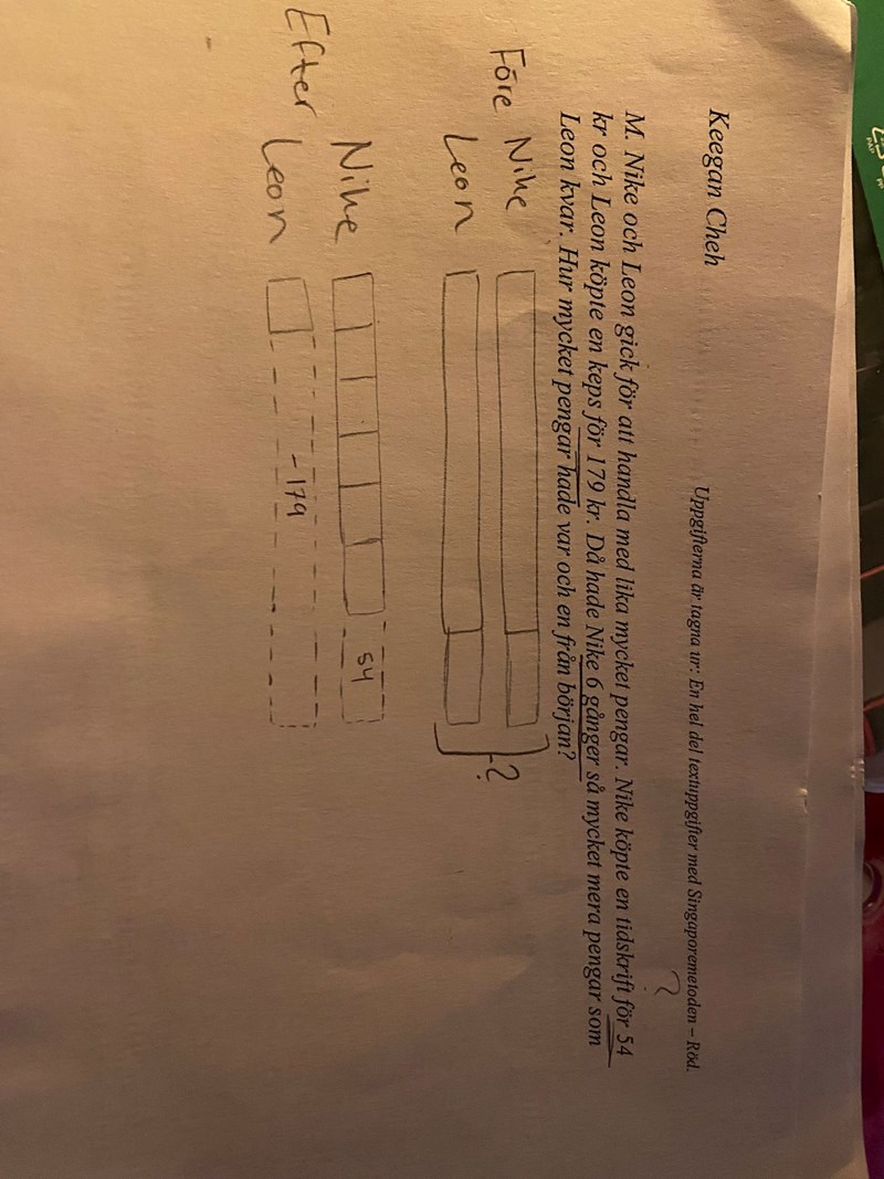 Om Nike sen hade 6ggr så mycket som Leon betyder ju det att pengarna som Leon hade kvar multiplicerat med 6 är lika mycket som vad Nike har kvar. Det kan vi skriva såhär: