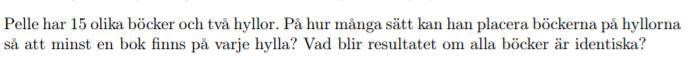 Jag tänker att om jag tar en hylla i taget, så har jag 15! att välja böckerna, sedan har jag 14 alternativ på vilken bok som jag kan börja med. så då borde det bli 15!*14, bör jag dock multiplicera med 2 eftersom jag har den andra bokhyllan eller är 15!*14 alla mina permutationer redan? (antag att jag ens har räknat rätt till och börja med).