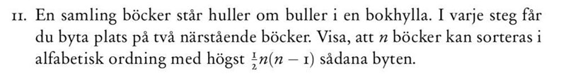Antag nu att du har n böcker som kan sorteras med högst n(n+1)2=n2+n2 steg. Du sätter sedan in en ny bok någonstans i hyllan. Antalet böcker är nu n+1 och vi vill bevisa att de kan sorteras med (n+1)(n+2)2=n2+n+2n+22=n2+n2+n+1 steg.