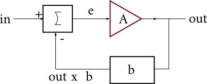 Men om förstärkaren (A) och återkopplingen (b) fasvrider -180 grader så kommer in och out x b att adderas amplitudmässigt. Det blir två minustecken som tar ut varandra.