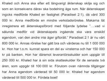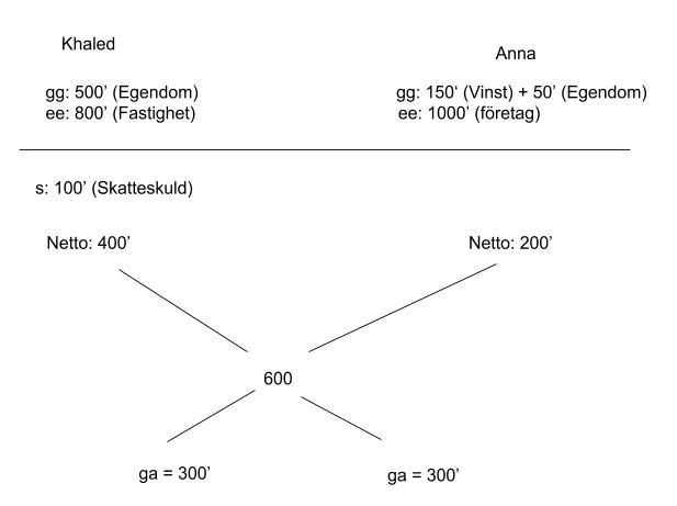 Min lärare sa att Khaled har fått 400' istället för 300' iom skulden. Så ga (giftorättsandelen) ska vara 400' istället för Khaled? Men ska inte ga delas lika?