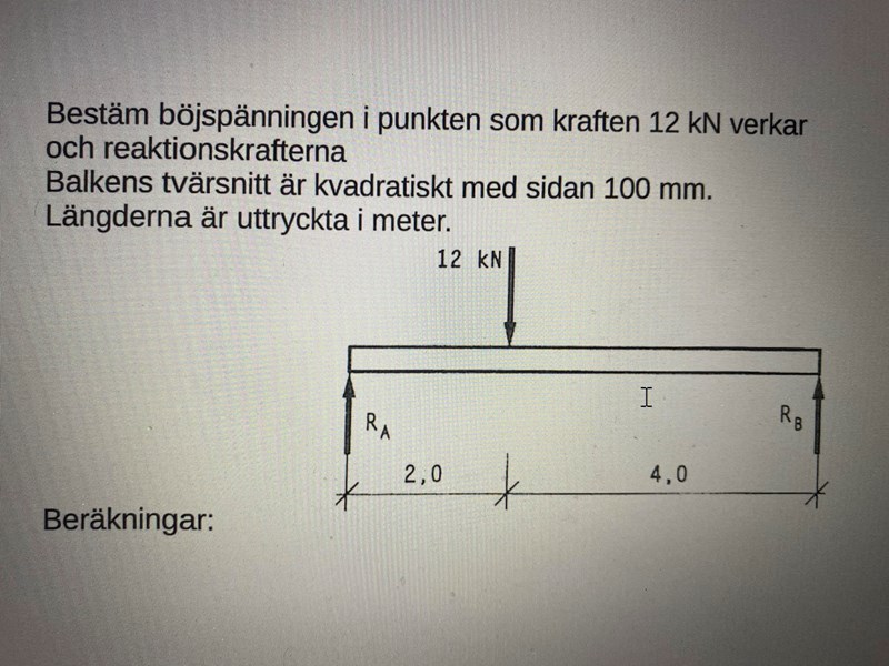 Uppgiften: Bestäm böjspänningen i punkten som kraften 12kN verkar och reaktionskrafterna. Balkens tvärsnitt är kvadratiskt med sidan 100mm. Längderna är utryckta i meter.