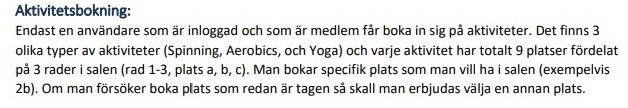 Den mest komplicerade operationen i sammanhanget är att läsa in namnet på en plats och kolla om den är bokad, så titta på den och bryt ner den i steg och vilka datastrukturer du behöver. Användaren skriver t.ex. "2a" och programmet ska hitta rätt plats i datastrukturerna och meddela om den var bokad.